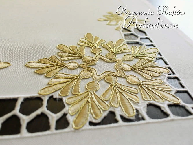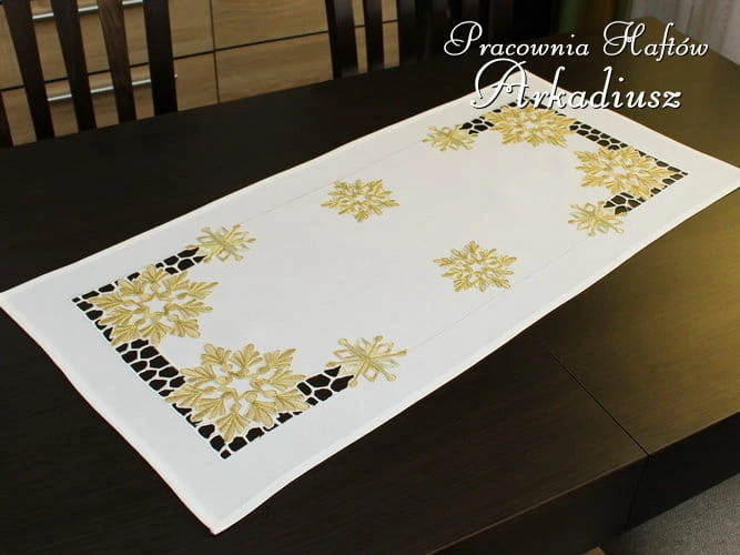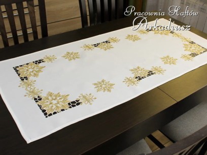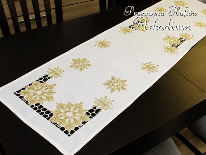 Bieżniki świąteczne w kolorze białym zdobione haftowanymi komputerowo beżowo złotymi śnieżynkami. Bieżniki dostępne w trzech rozmiarach 40x85, 55x120 oraz 40x160 cm.