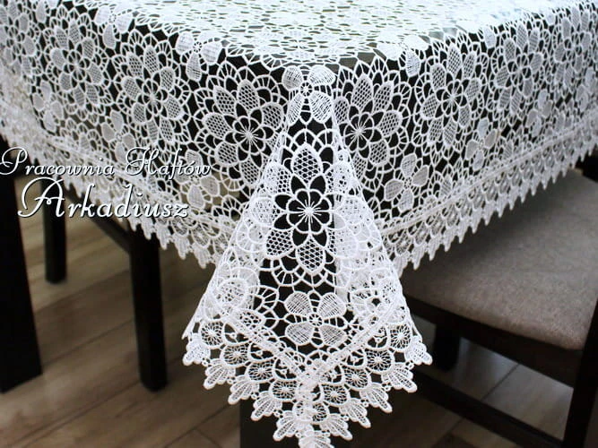Białe obrusy gipiurowe dostępne w kilku rozmiarach. Obrusy z koronki gipiurowej to gustowna i niewymagająca dekoracja stołu.