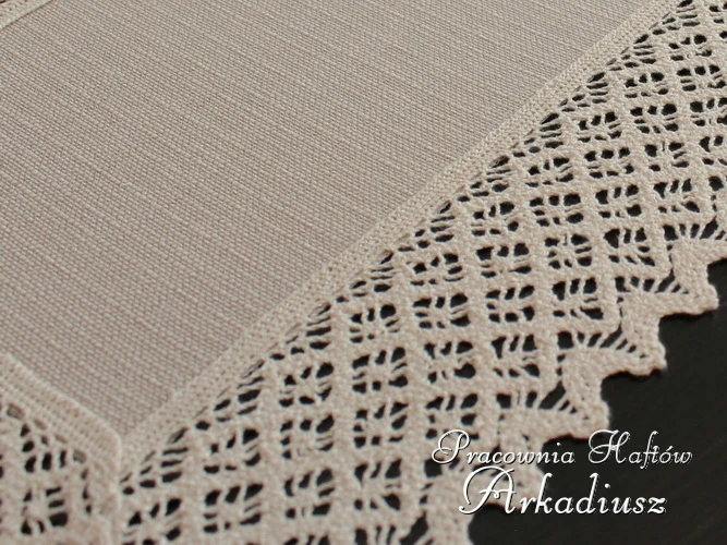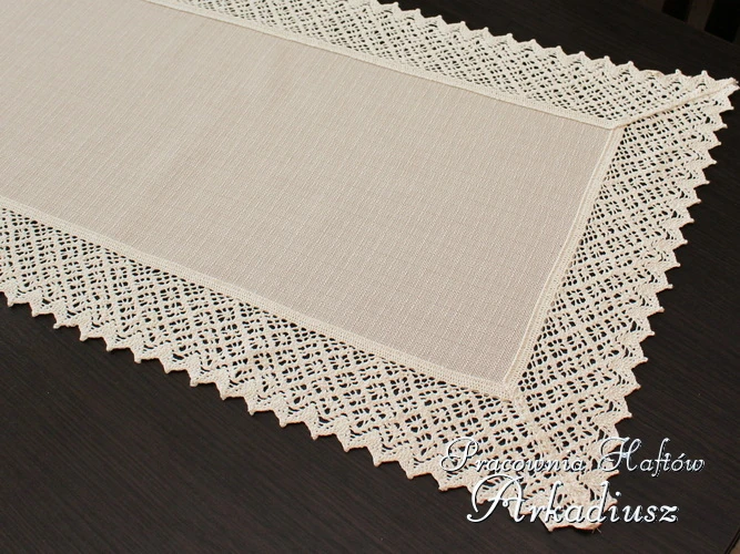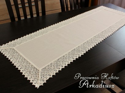 Bieżniki w kolorze beżowym o naturalnym wyglądzie z kolekcji "Koronka len". Nadzwyczaj gustowne serwety, szyte z tkaniny bawełnianej z dodatkiem poliestru o lnianym wyglądzie, obszywane koronką klockową wykonaną maszynowo. dostępne w kilku rozmiarach jak również z możliwością wykonania na wymiar.