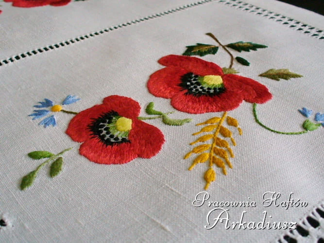 Przedstawiamy jeden z wyjątkowych produktów w naszej ofercie. Przepięknie i bardzo bogato zdobiona ręcznie wykonanym haftem serweta lniana z brzegami wykończonymi ozdobną mereżką.