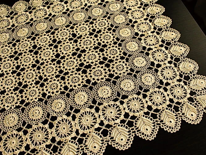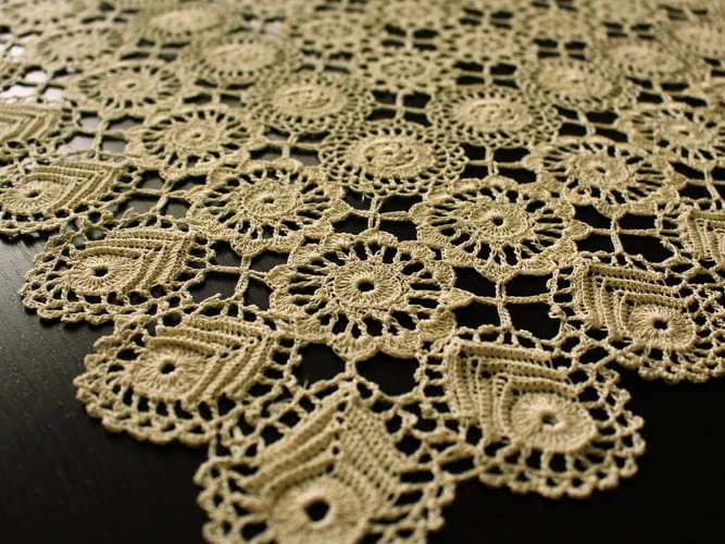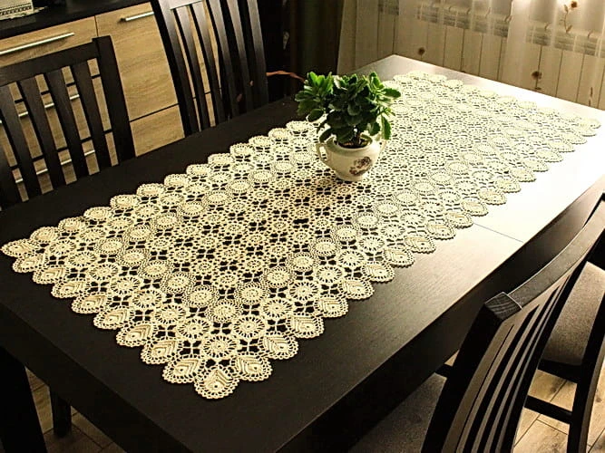 Duży bieżnik z koronki koniakowskiej. Prostokąt o rozmiarach 55x115 cm. w kolorze beżowym. Wykonany ręcznie na szydełku przez koronczarkę z Koniakowa