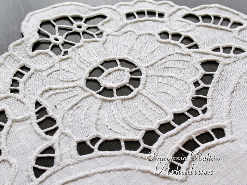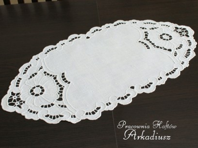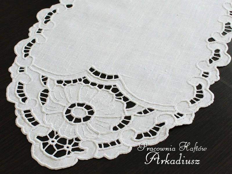 Bieżnik z grubego płótna lnianego, zdobiony precyzyjnym ręcznym haftem richelieu. Owalny bieżnik w kolorze białym, w rozmiarze 36x70 cm. w eleganckim tekturowym pudełku.