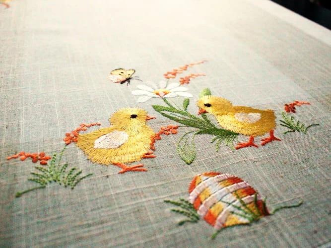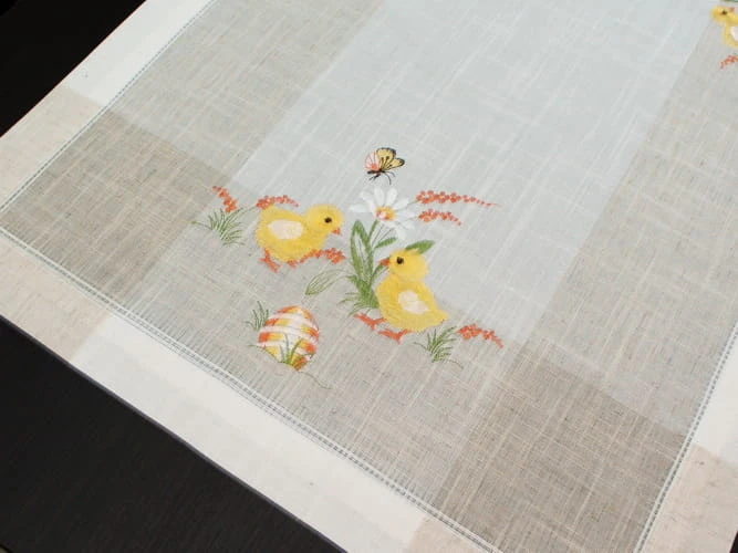Lnianopodobne bieżniki wielkanocne dostępne w kilku rozmiarach zdobione delikatnym haftem komputerowym, uszyte z tkaniny poliestrowej z domieszką lnu.