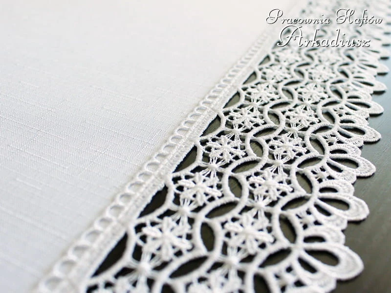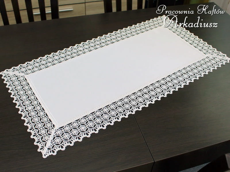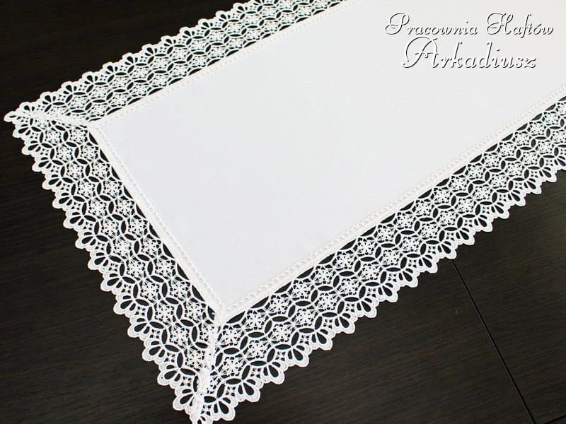 Białe bieżniki z kolekcji "Julia". Wykonane z tkaniny imitującej len wykończonej gipiurą, o doskonałym wyglądzie i walorach plamoodpornych. Dostępne w wielu rozmiarach.