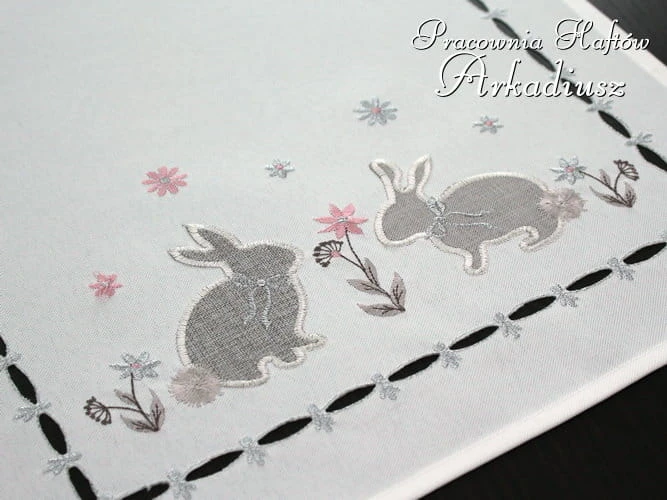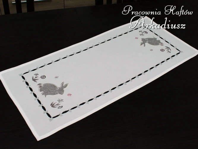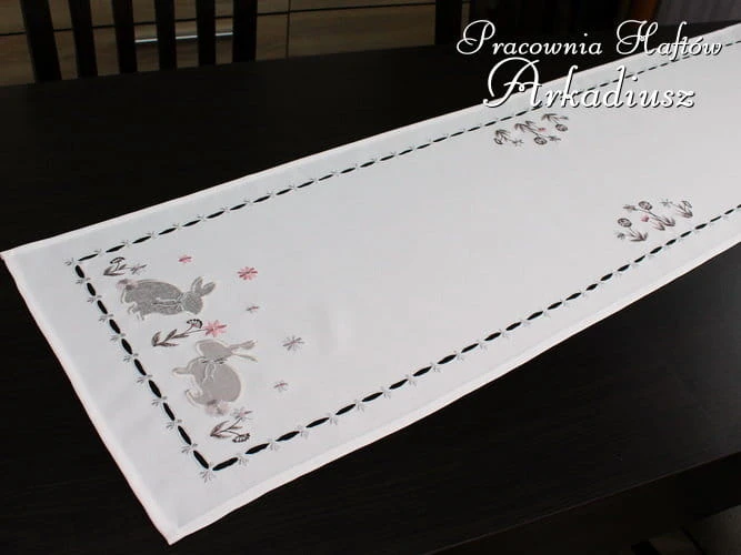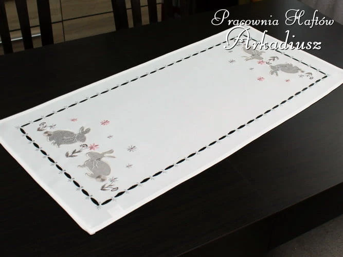 Bieżniki wielkanocne z szarymi zajączkami haftowanymi na białej tkaninie poliestrowej o naturalnym wyglądzie. Bieżniki dostępne w kilku wersjach rozmiarowych