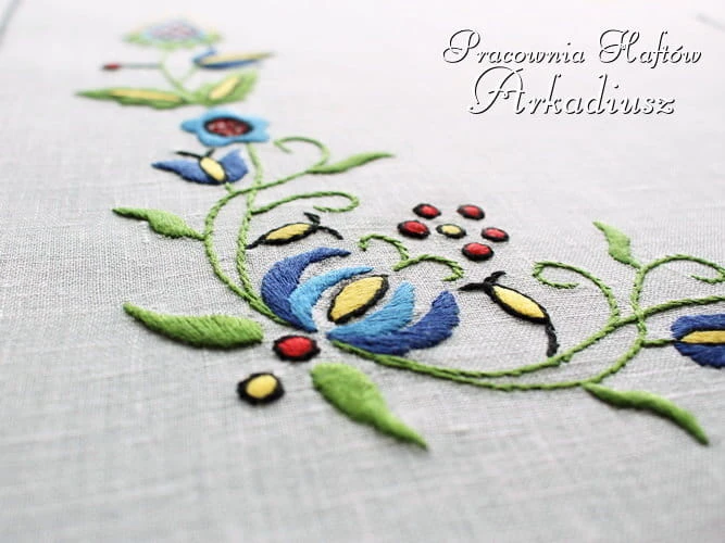 Prawdziwe rękodzieło. Bieżnik z ręcznie wykonanym haftem kaszubskim, haft wykonany na tkaninie lnianej wykończonej mereżką