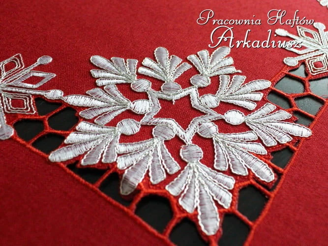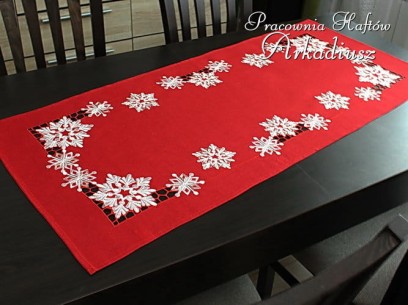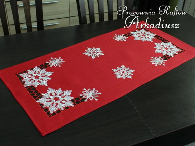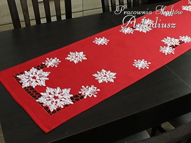 Bardzo ładne bieżniki świąteczne w kolorze czerwonym zdobione haftowanymi komputerowo śnieżynkami. Bieżniki dostępne w trzech rozmiarach 40x85, 55x120 oraz 40x160 cm.