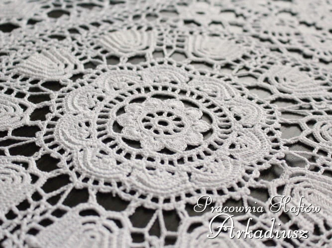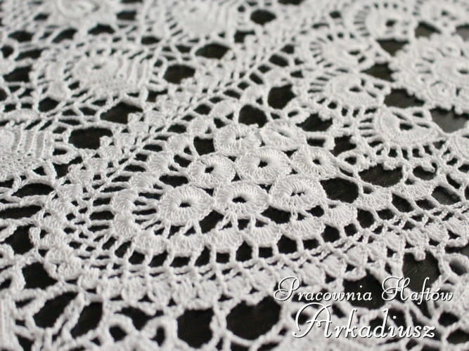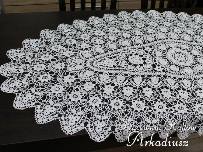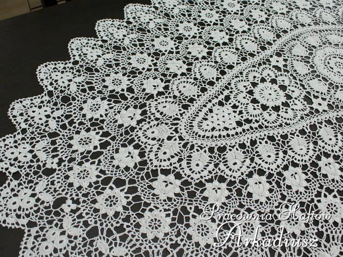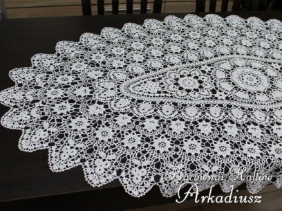 Wyjątkowo duża serweta koronkowa i o bogatym wzornictwie. Oryginalny wyrób koniakowskiej koronczarki. Bieżnik w rozmiarze 90x150 cm w kolorze białym.