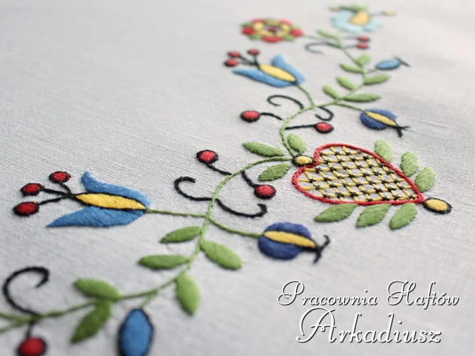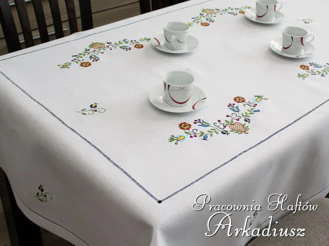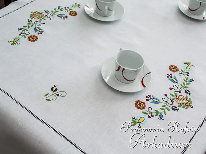 Przepiękny produkt polskiego rękodzieła ludowego. Obrus lniany zdobiony haftem kaszubskim wykonanym ręcznie.