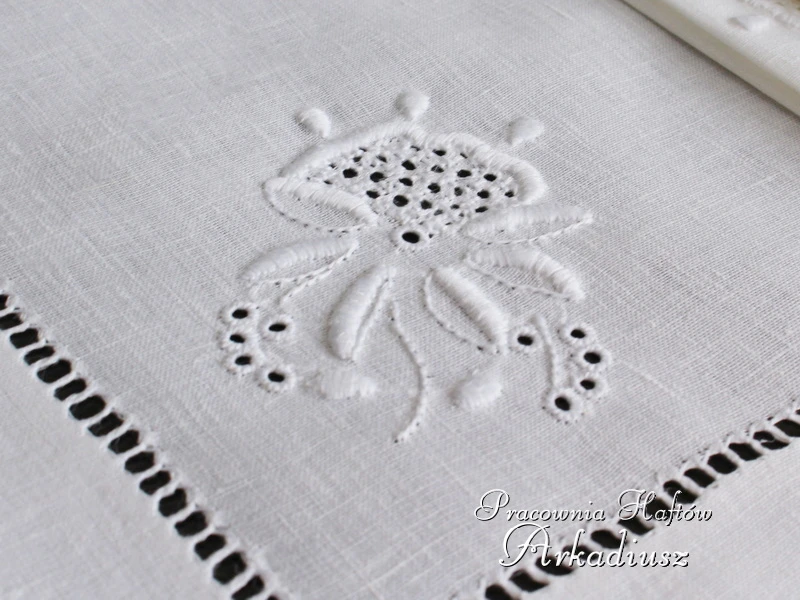 Komplet sześciu serwetek, zdobionych ręcznie haftem makowskim brzegi wykończone mereżką również wykonaną ręcznie. Serwety lniane w rozmiarze 38x38 cm. zapakowane w eleganckie tekturowe pudełko.
