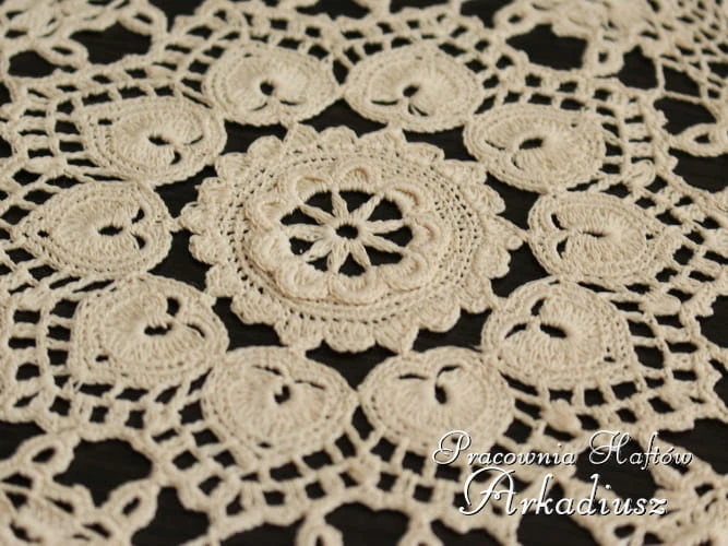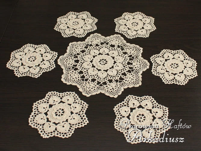Piękny komplecik oryginalnych serwetek koniakowskich w kolorze beżowym. Zestaw składa się z sześciu małych serwetek ok 15cm oraz jednej większej o średnicy ok 23 cm