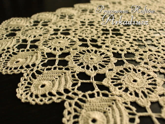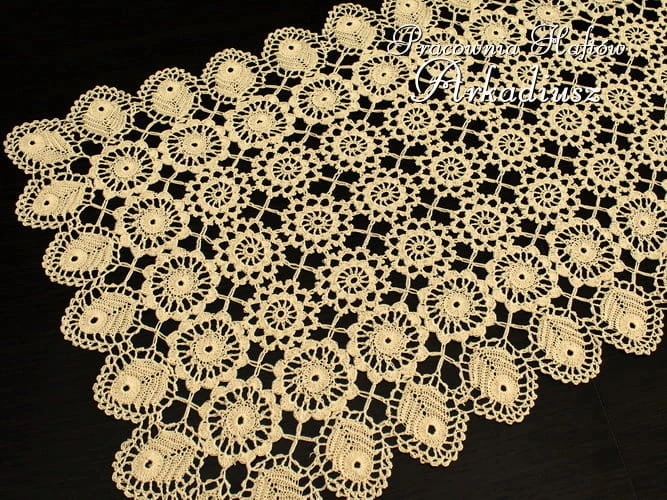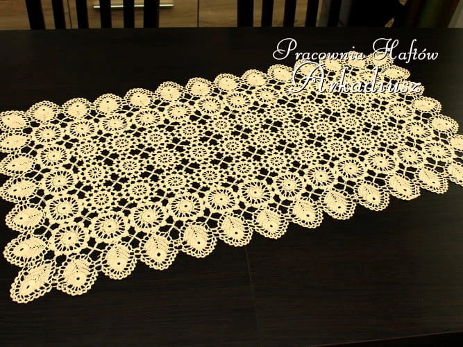 Precyzyjnie wykonany bieżnik koniakowski. Serweta prostokątna o rozmiarach 40x85 cm. w kolorze beżowym. Zrobiona ręcznie na szydełku przez koronczarkę z Koniakowa