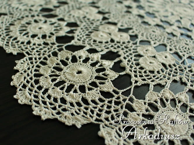 Serweta koniakowska o średnicy 70 cm wykonana ręcznie na szydełku z bawełnianego kordonka mercyzowanego w kolorze beżowym.