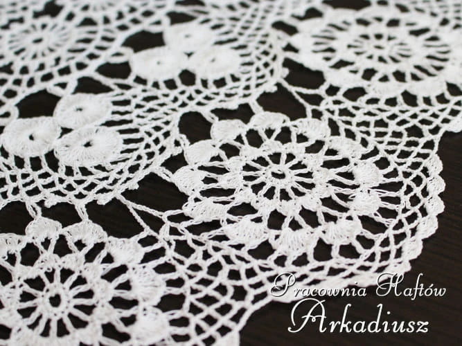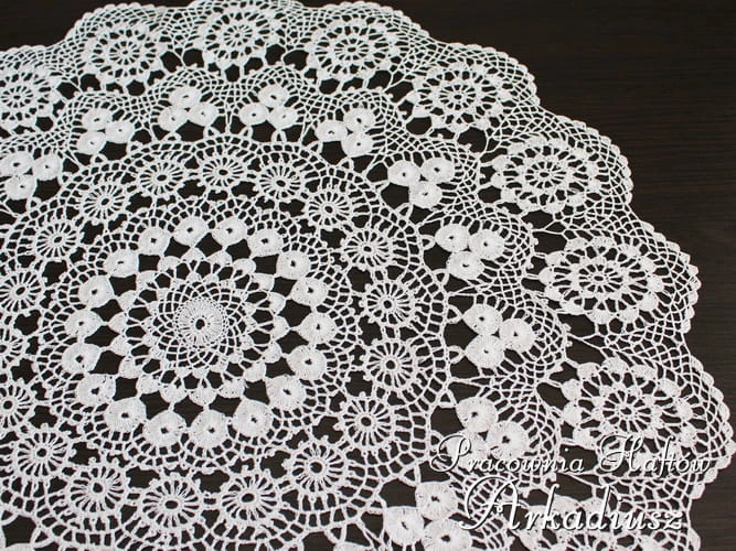 Serweta koniakowska o średnicy 70 cm wykonana ręcznie na szydełku z bawełnianego kordonka mercyzowanego w kolorze białym.