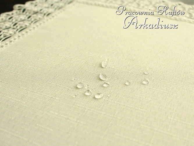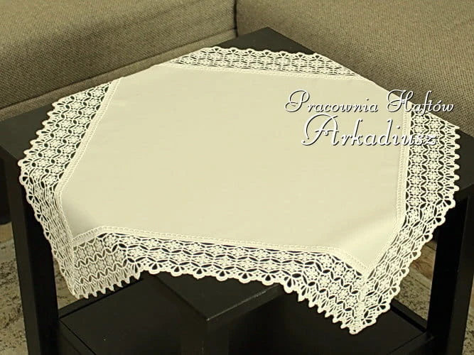 Serwety kwadratowe zdobione gipiurą w kolorze ekri, uszyte z teflonowanej czyli plamoodpornej tkaniny o strukturze tkaniny lnianej, dostępne w różnych rozmiarach.