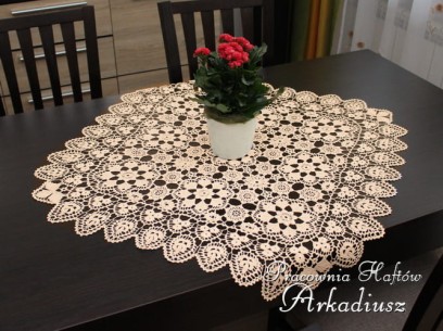 Serweta koronkowa kwadrat w rozmiarze 85x85 w kolorze beżowym wykonany ręcznie na szydełku przez koniakowską koronczarkę.