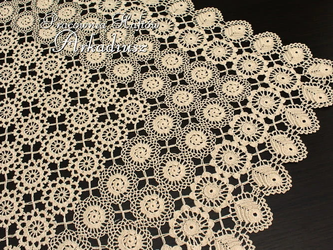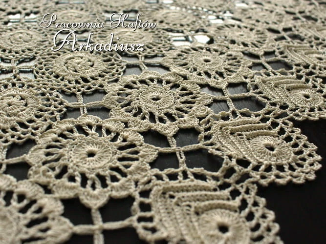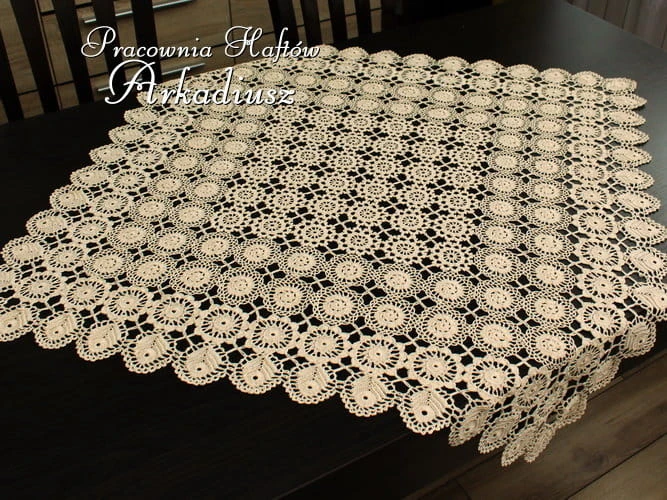 Serweta koronkowa kwadrat w rozmiarze 80x80 w kolorze beżowym wykonany ręcznie na szydełku przez koniakowskie koronczarki.