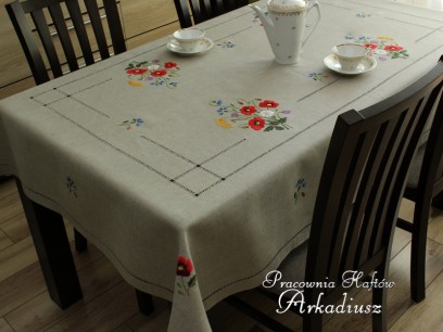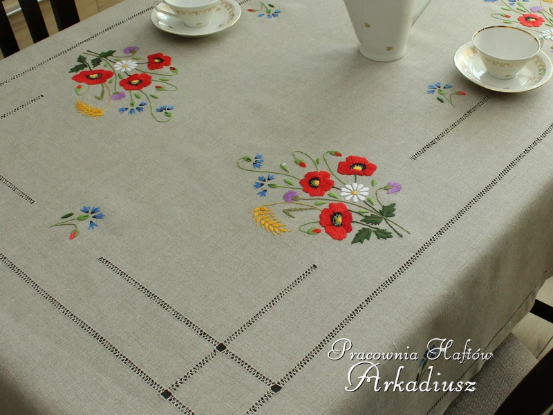 Wyjątkowy obrus lniany. Bardzo precyzyjnie haftowany obrus z czerwonymi makami, zdobiony ozdobną mereżką. Obrus w rozmiarze 130x190 cm wykonany z szarego płótna lnianego zapakowany w pudełko tekturowe.