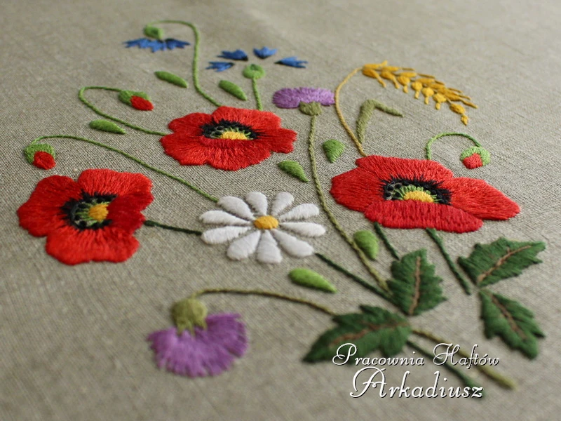 Obrus haftowany ręcznie "Maki" na szarym lnie 130x190