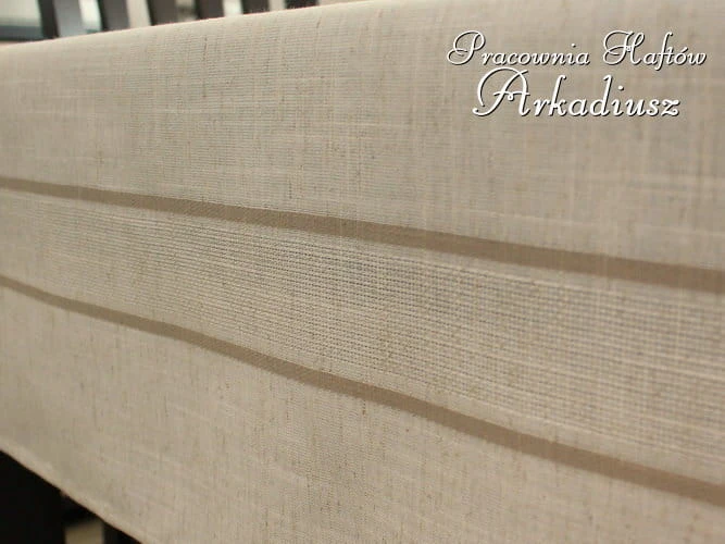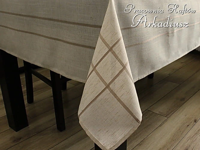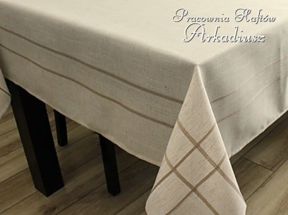 Prezentowany przez nas produkt przypomina tradycyjne obrusy lniane, a jest uszyty z nowoczesnej tkaniny poliestrowej. Kolor obrusu jest typowym kolorem surowego płótna lnianego dodatkowo ozdobne pasy o ciemniejszym odcieniu nadają obrusowi eleganckiego charakteru.