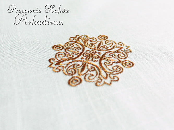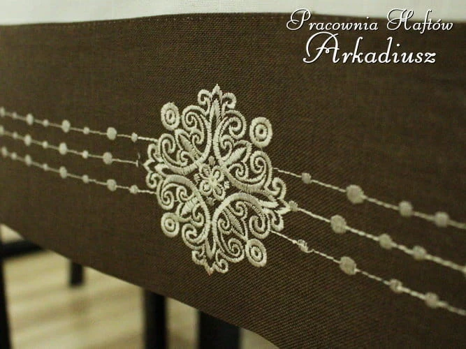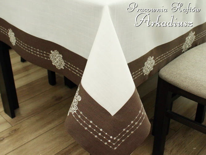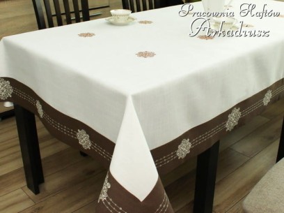 Obrusy doskonale imitujące obrusy lniane z białym środkiem w odcieniu kości słoniowej na brzegach doszyta ciemnobrązowa listwa. obrusy zdobione delikatnym haftem komputerowym.