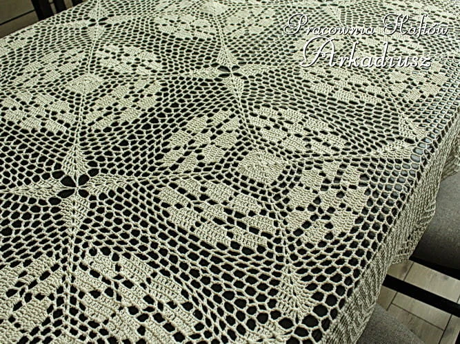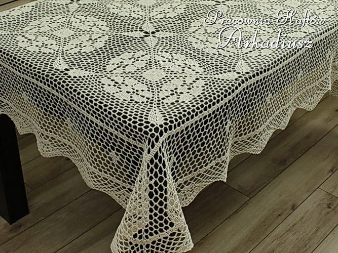 Obrus ręcznie wykonany szydełkiem z grubszej przędzy bawełnianej. Obrus szydełkowy w kolorze beżowym.