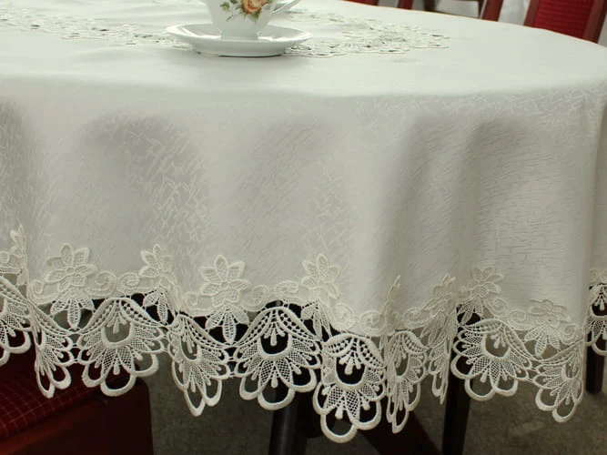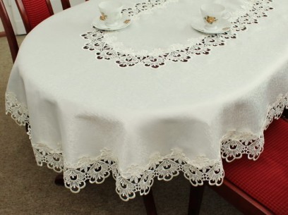 Mamy do zaoferowania owalne obrusy w kolorze ekri zdobione koronką gipiurową, wykonane z trwałego poliestru, dzięki czemu są łatwe w utrzymaniu czystości i jednocześnie elegancko się prezentują. Obrusy dostępne w kilku wersjach rozmiarowych.