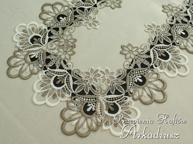 Oferujemy prostokątne obrusy zdobione dwukolorową koronką gipiurową, dostępne w kilku wersjach rozmiarowych. Obrusy uszyte z trwałego poliestru, dzięki czemu są łatwe w utrzymaniu czystości i elegancko się prezentują.