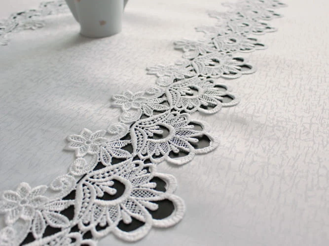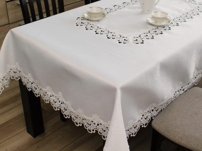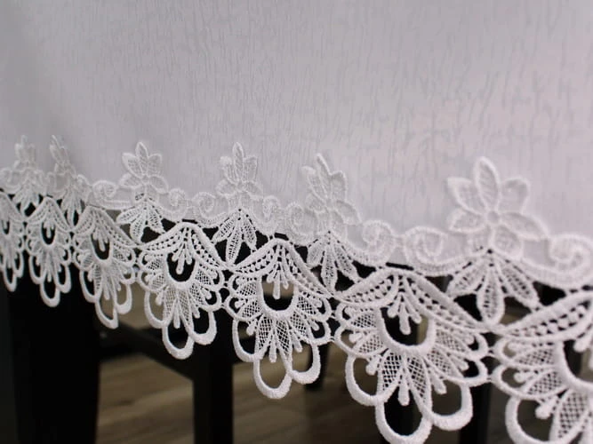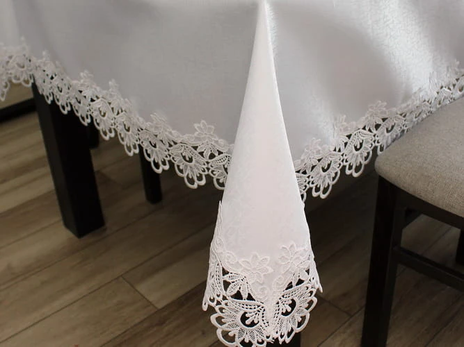 Proponujemy białe prostokątne obrusy zdobione koronką gipiurową, wykonane z trwałego poliestru, dzięki czemu są łatwe w utrzymaniu czystości i elegancko się prezentują. Obrusy dostępne w kilku wersjach rozmiarowych.