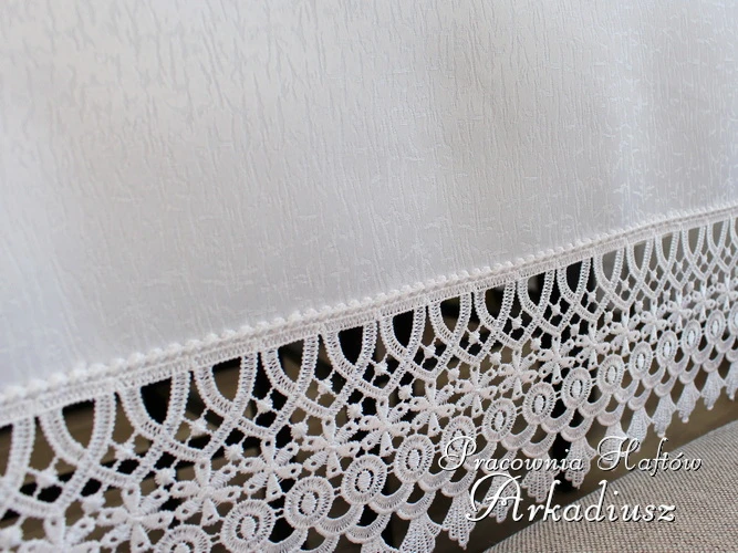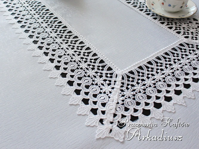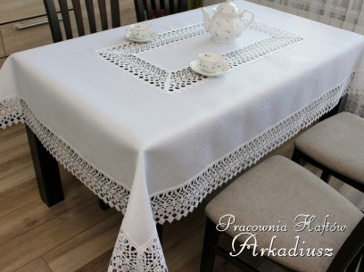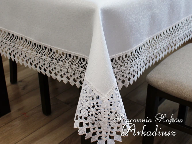 Elegancki obrus Honorina w kolorze białym z dekoracyjną koronką gipiurową to idealne połączenie stylu i funkcjonalności. Trwały, łatwy w pielęgnacji i doskonały na co dzień oraz wyjątkowe okazje, dostępny w różnych rozmiarach.