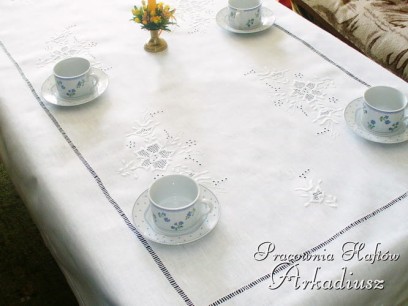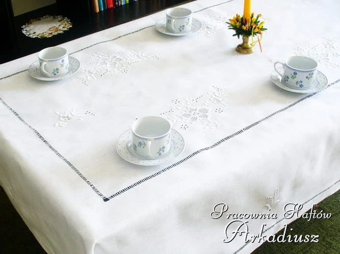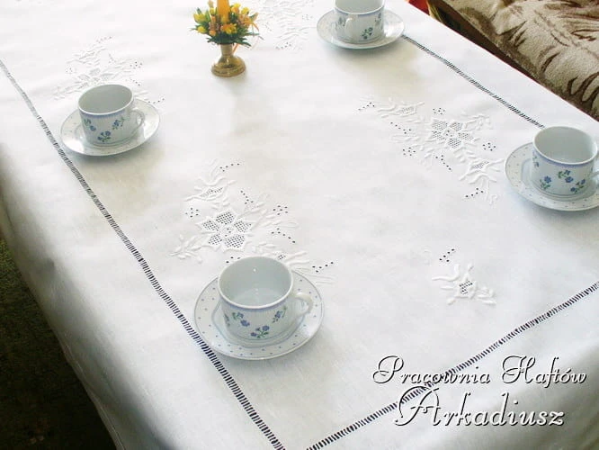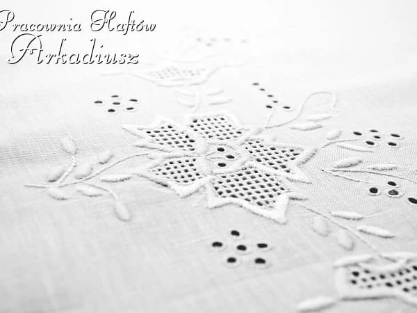 Elegancki produkt polskiego rękodzieła, lniany obrus w kolorze białym z haftowanym motywem o nazwie "Róża makowska". Haft wykonany ręcznie z pełną precyzją, w stylu makowskim. Dodatkowym zdobieniem są również ręcznie wykonane mereżki.