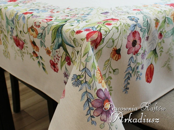 Obrusy gobelinowe z motywem folkowych kwiatów. Trwała, tkana tkanina zachwyca intensywnymi kolorami i elegancją, wprowadzając do wnętrza ciepły, stylowy klimat inspirowany tradycją. obrusy dostępne w kilku wariantach rozmiarowych.