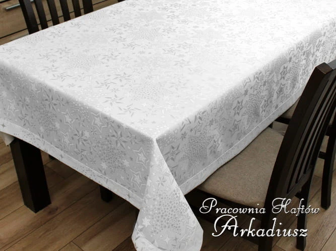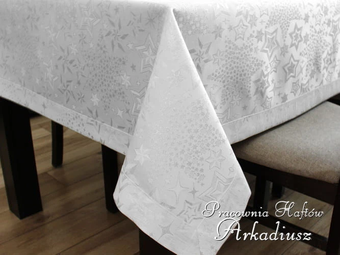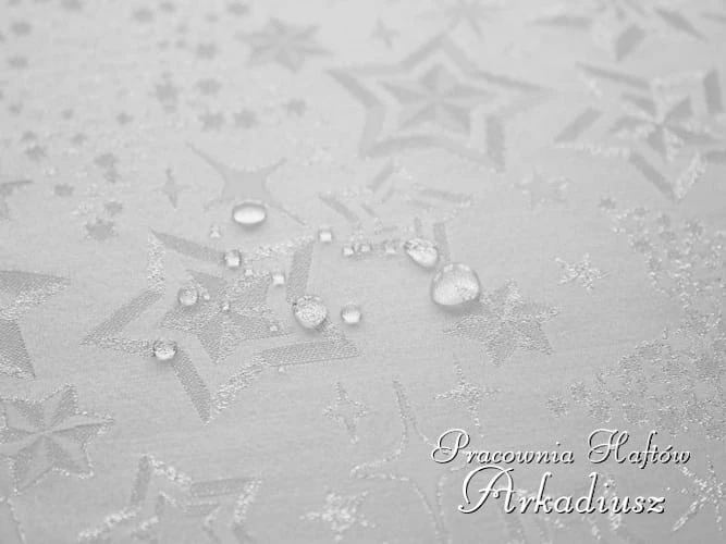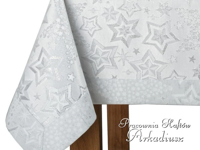 Wysokiej jakości obrusy świąteczne białe z srebrnym wzorem gwiazd. Obrusy z tkaniny poliestrowej o właściwościach plamoodpornych tkanej srebrną nitką metalizowaną. Te obrusy możemy wykonać również na wymiar.