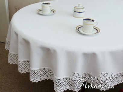 Obrusy okrągłe z kolekcji "Koronka len", szyte z tkaniny bawełnianej z dodatkiem poliestru bardzo dobrze imitującą tkaninę lnianą, obszywane koronką bawełnianą.