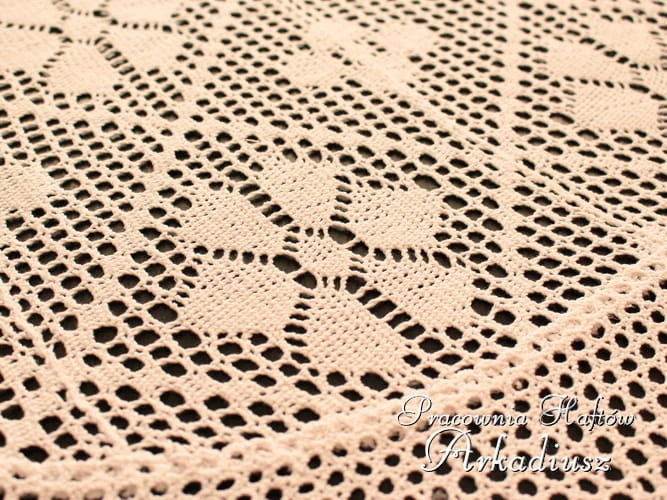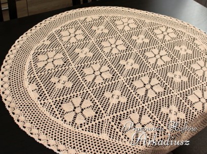 Proponujemy obrus z koronki bawełnianej w kolorze beżowym. Okrągły obrus z koronki klockowej wykonany maszynowo, jest bardzo fajną imitacją ręcznie robionych obrusów szydełkowych.