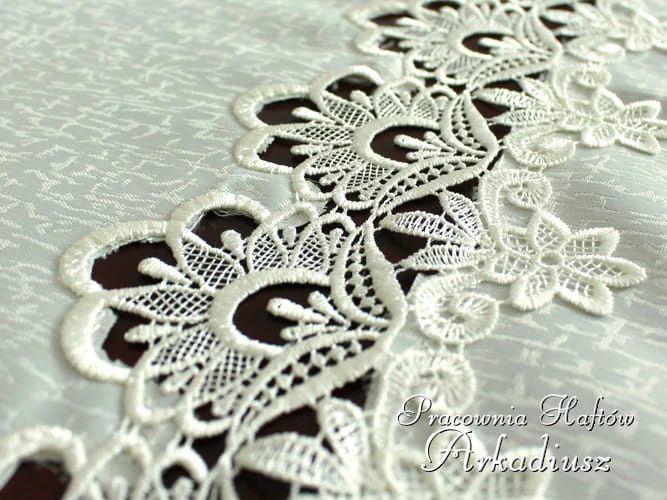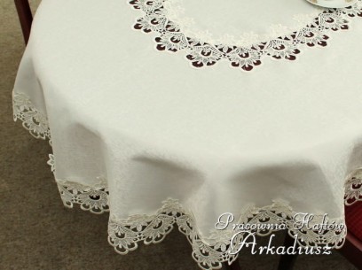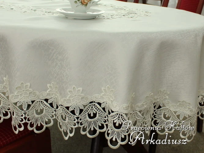 Okrągłe obrusy w kolorze ekri, zdobione koronką gipiurową, dostępne w kilku średnicach. Obrusy zostały wykonane z tkaniny poliestrowej, dzięki czemu są łatwe w utrzymaniu czystości i elegancko się prezentują.