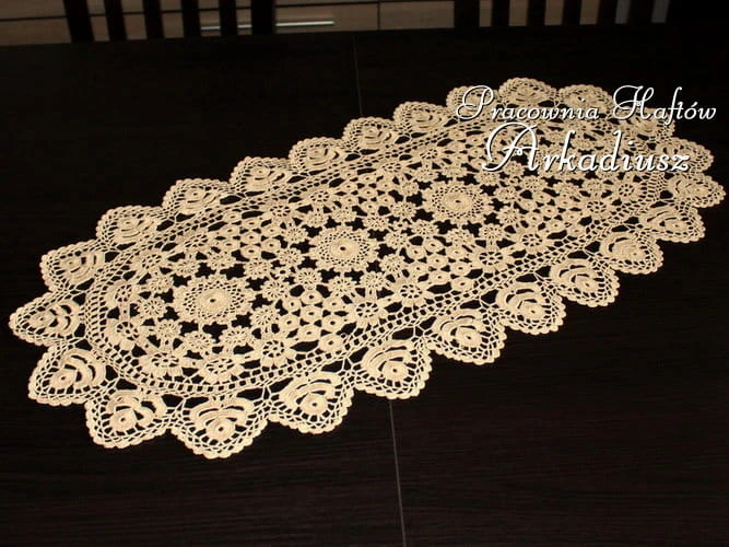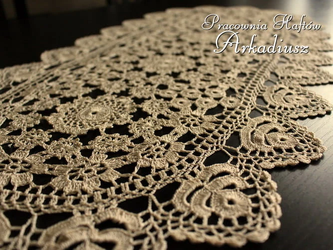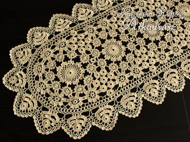 Precyzyjnie wykonana koronka koniakowska. Serweta owalna o rozmiarach 32x70 cm. w kolorze beżowym. Zrobiona ręcznie na szydełku przez Panie z Koniakowa