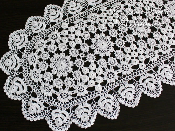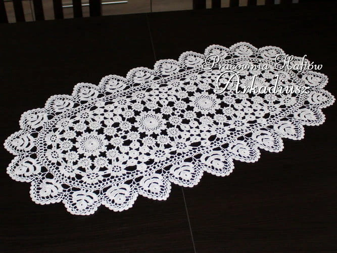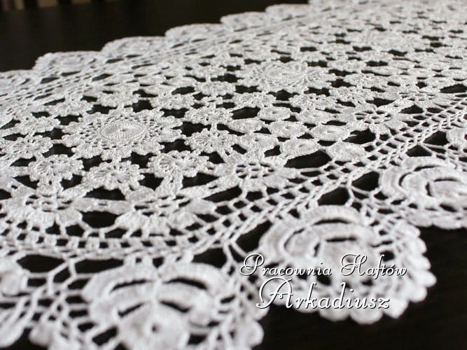 Bardzo precyzyjnie wykonana koronka koniakowska. Serweta owalna o rozmiarach 32x70 cm w kolorze białym. Zrobiona ręcznie na szydełku przez Panie z Koniakowa