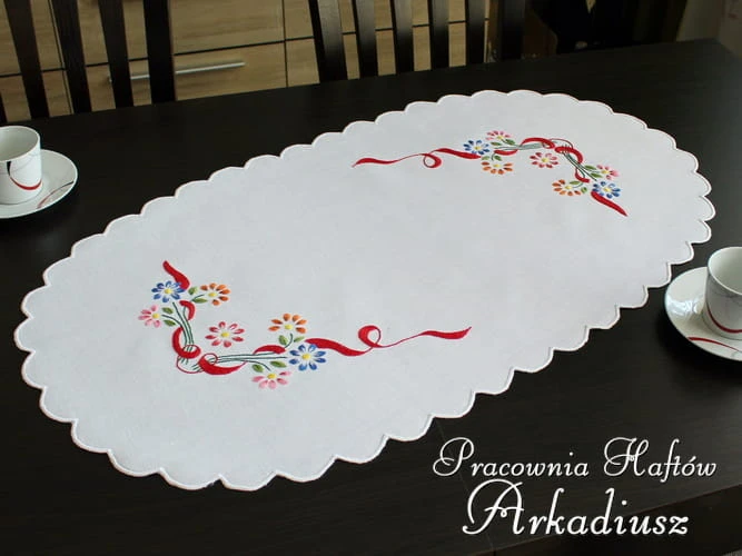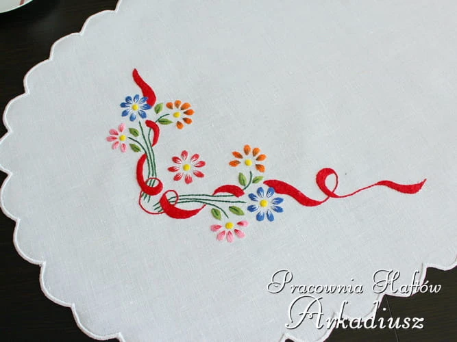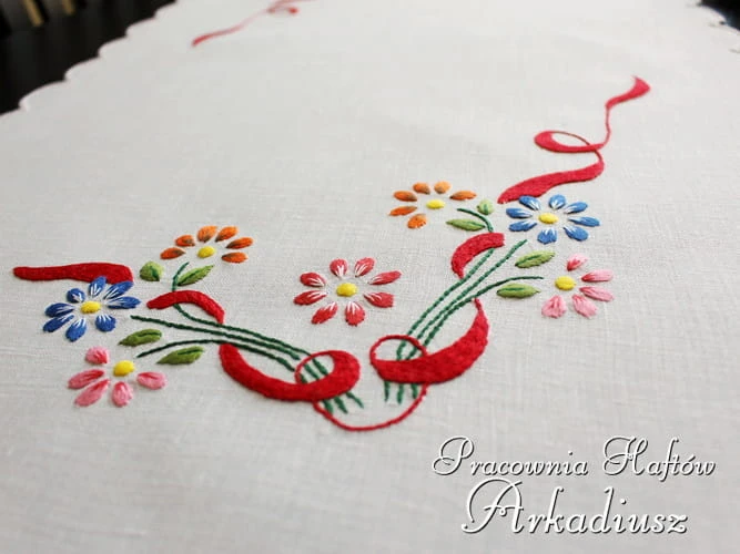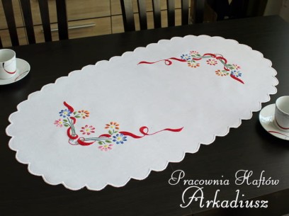 Owalny bieżnik lniany w rozmiarze 50x90cm zdobiony ręcznym haftem. Bieżnik wykonany przez hafciarkę ludową z okolic Makowa Podhalańskiego.