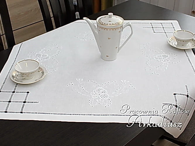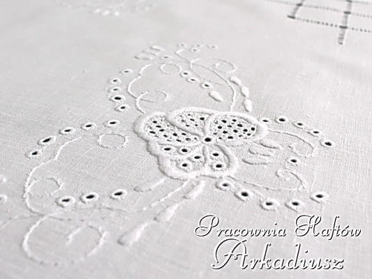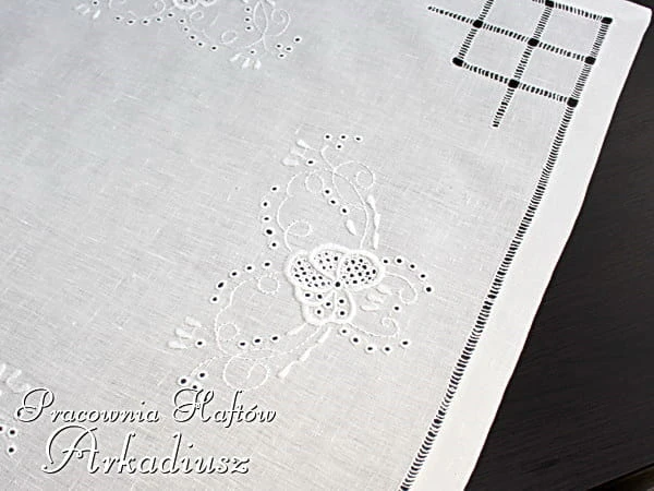 Ręcznie haftowana serweta kwadratowa. Biała serweta z tkaniny lnianej z haftem makowskim, brzegi serwety wykończone i ozdobione mereżką. Dzieło sztuki ludowej, szczególnie polecamy na prezent jako symbol polskiego rzemiosła.