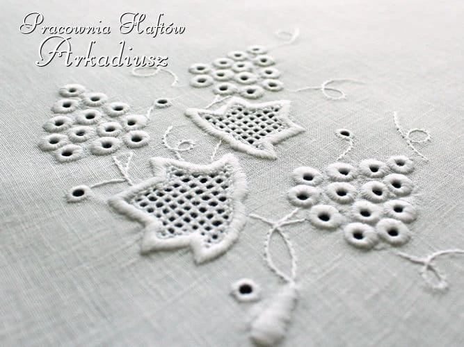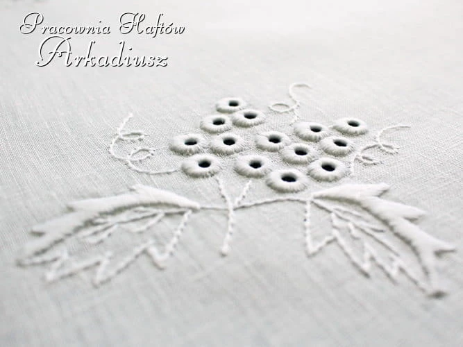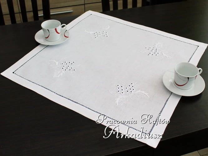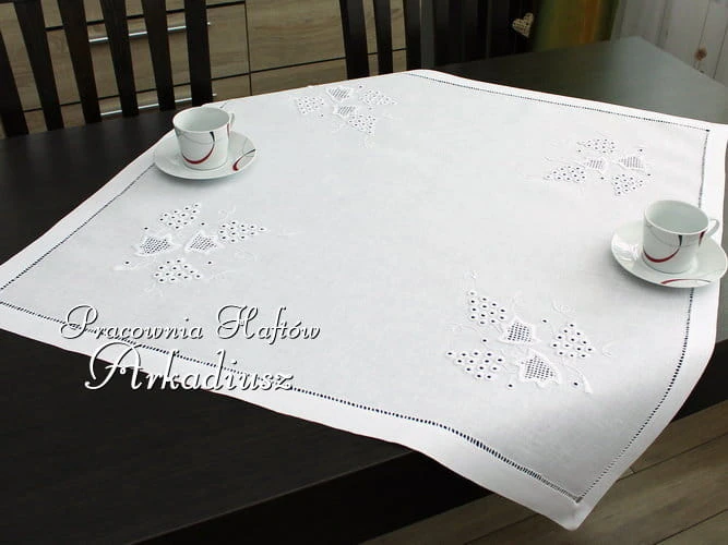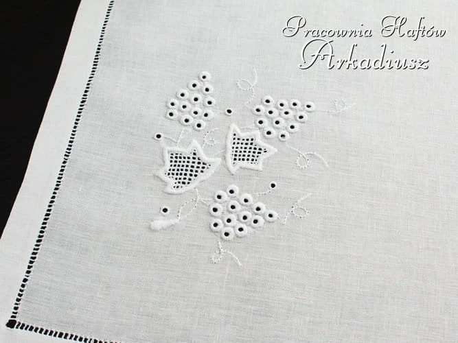 Serwety lniane ręcznie zdobione z haftem makowskim z elementami dziurkowania oraz haftu toledo. Kwadraty wykończone ręcznie wykonanymi mereżkami.