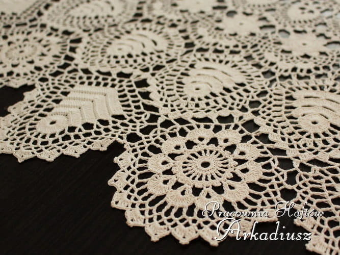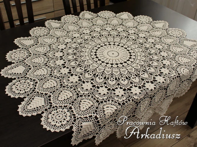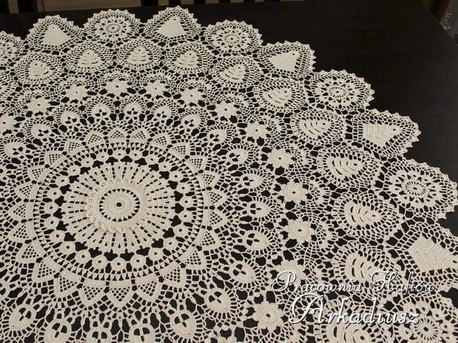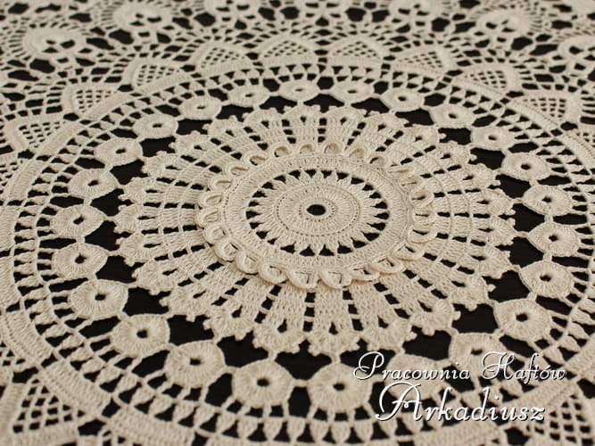 Duża okrągłą serweta wykonana z koronki koniakowskiej. Serweta o średnicy 100 cm. w kolorze beżowym. Ręczna praca koniakowskiej koronczarki na szydełku z beżowego kordonku mercyzowanego 100% bawełna.