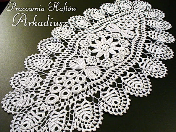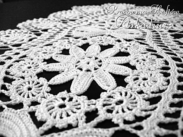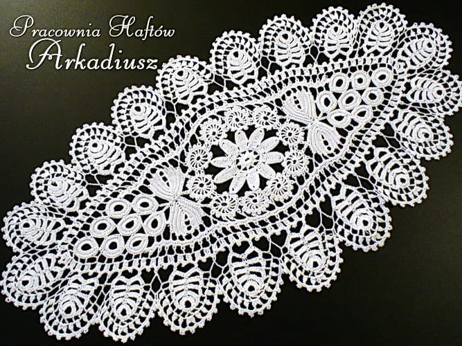 Misternie wykonana koronka koniakowska w kolorze białym o rozmiarach 25x45cm. Produkt polskiego rękodzieła, oryginalny wyrób koronczarki koniakowskiej.