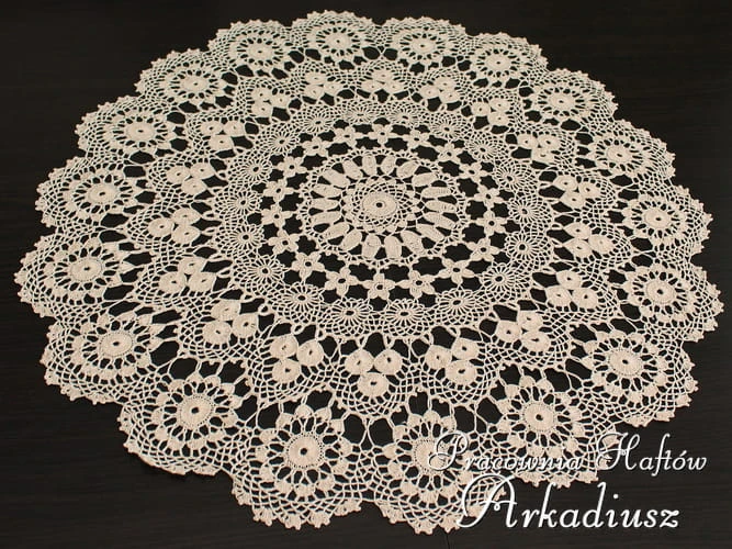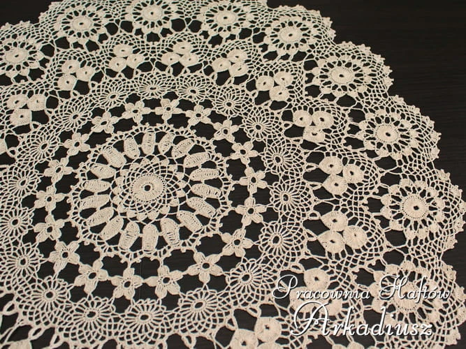 Koronkowa serweta wykonana przez koniakowską koronczarkę. Bardzo precyzyjnie wykonana serweta o średnicy 60 cm, w ciepłym beżowym kolorze.