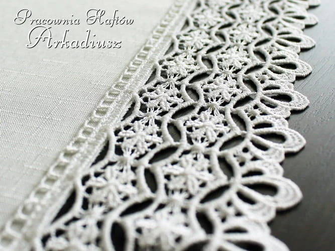 Serwety poliestrowa w kolorze ekri, zdobiona koronką gipiurową w złotym odcieniu. Serwety kwadratowe z teflonowanej czyli plamoodpornej tkaniny imitującej len, dostępne w różnych rozmiarach.