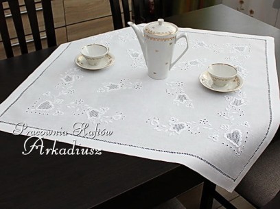 Serweta lniana kwadratowa, bardzo precyzyjnie i bogato haftowana haftem makowskim polecana miłośnikom polskiego rękodzieła.