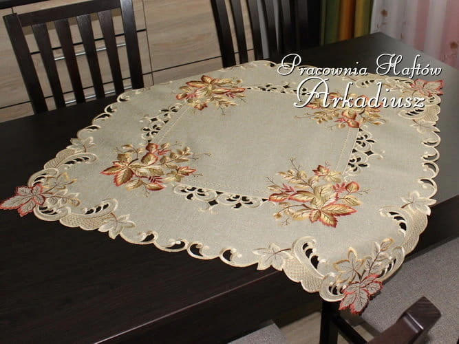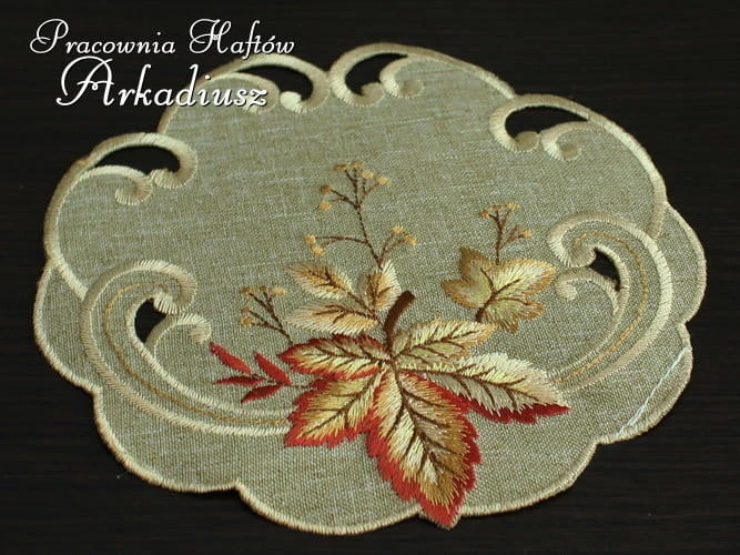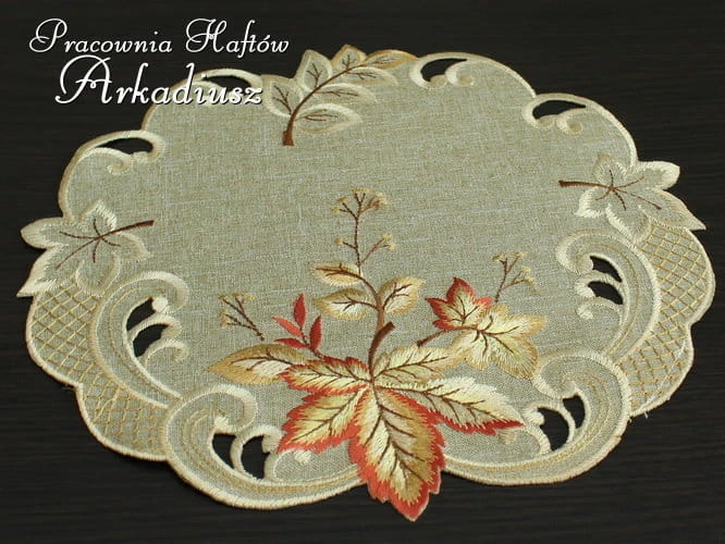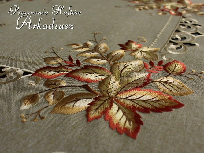 Serwety i serwetki zdobione haftem komputerowym w pięknej jesiennej kolorystyce z tkaniny poliestrowej imitującej len