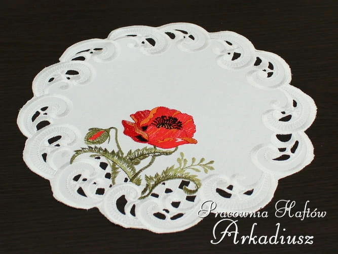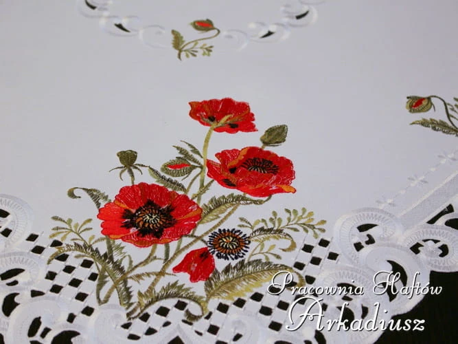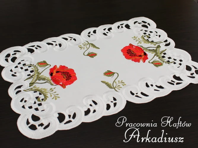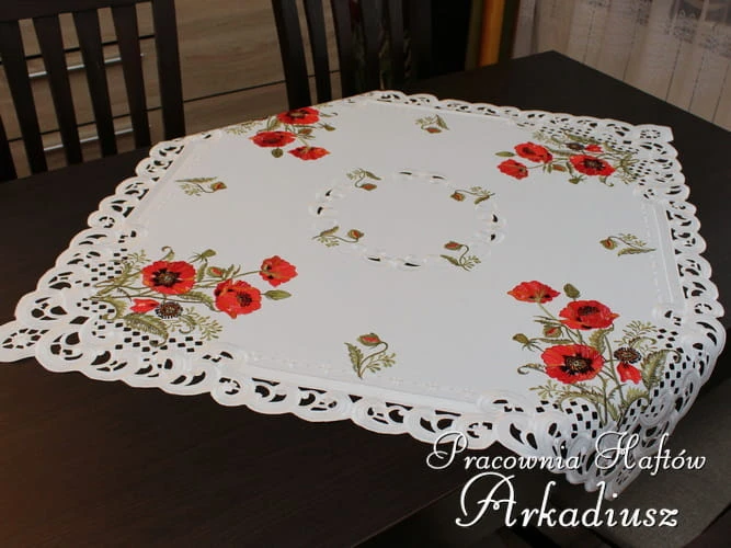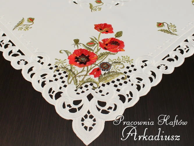 Bogato haftowane z wzorem czerwonych maków serwety z tkaniny poliestrowej dobrze imitującej len. Serwety dostępne w rozmiarach 85x85 oraz małe 30x45 i okrągłe o średnicy 30 cm.