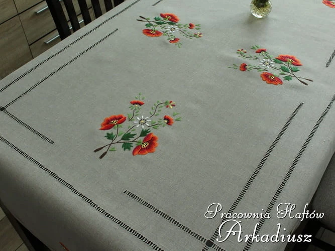 Obrus z szarego płótna lnianego zdobiony ręcznie haftowanymi kolorowymi bukietami polnych maków. Obrus dodatkowo zdobiony pięknie wykonaną ręcznie mereżką.