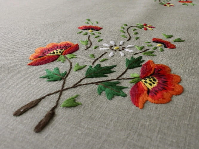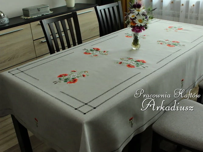 Szary obrus z ręcznym haftem "Bukiet maków"